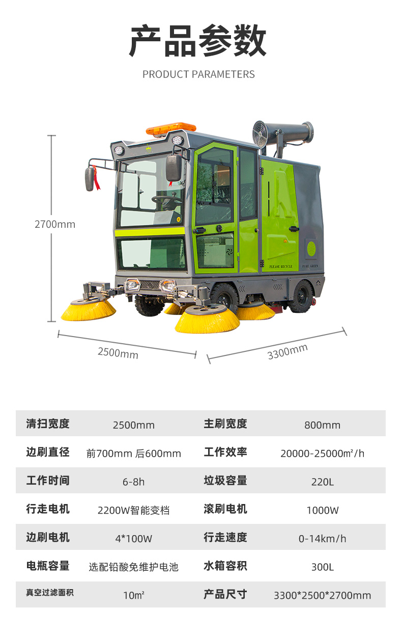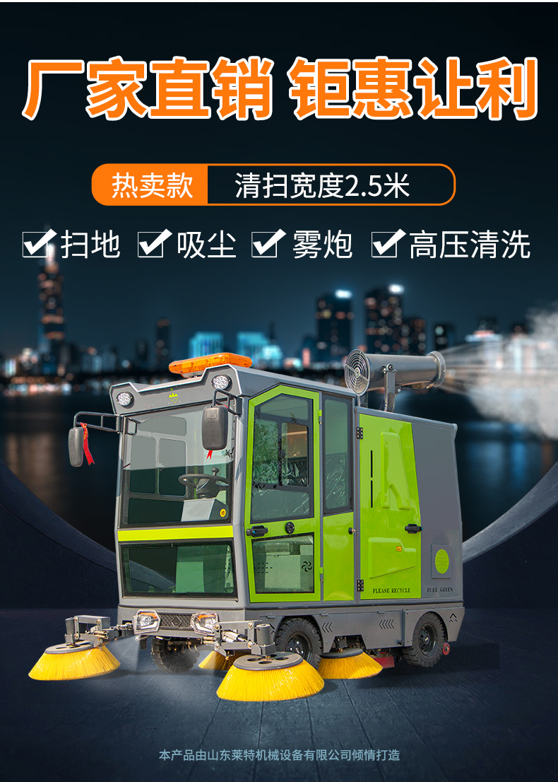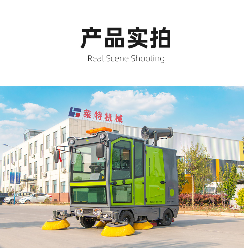 莱特LT-G50型全封闭四轮驾驶式扫地车,配备高压清洗和高压雾炮功能,清扫宽度2500mm,满电工作时间为6-8小时,工作效率25000㎡/h,采用的是8*200A免维护铅酸电池,高压雾炮射程可达10米以上,可对作业环境高效的降尘,还可以用于绿植养护和环境消杀。高压水枪可以对地面顽固污渍进行清洁,还可以冲洗路牙石,为绿植浇水,工作之余,还可以用高压水枪清洗车辆。应用场景为:厂区、车间、公园、街道、物业小区、码头、学校、机场、停车场、地下车库、充电站、加油站、公园工厂、工业园区等需要大面积清扫的区域区域。